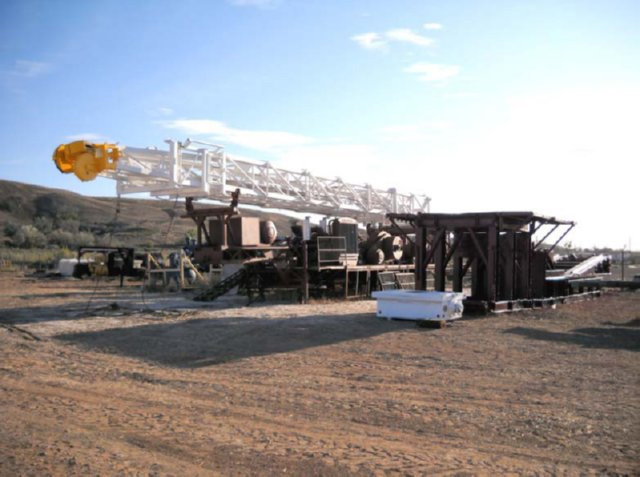 Detroit 12V diesel, single drum w/double jack shaft draw-works, 102ft. X 250,000# hyd raised derrick, hyd leveling jacks, McKissick 3 sheave block, 125 ton hook, 6 sheave crown, Martin Decker weight indicator, Parkerburg hydromatic brakes, Foster cat heads, 1” Lebus grooved drum, stand pipe racking board w/cat walks & stairs, mounted on tri-axle trailer. Sandblasted and primed. Needs work.